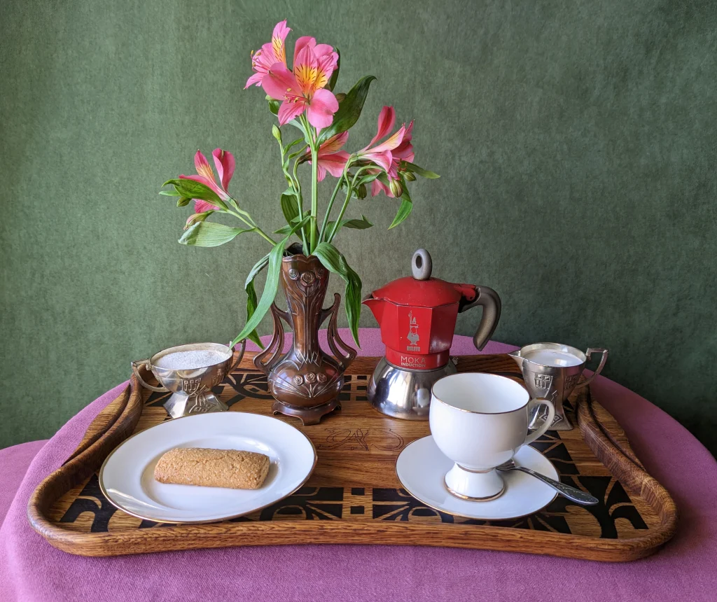 Как видите, минимальный состав из 7 предметов и все они должны быть размещены на одном подносе или подносике и не в притык друг к другу. С подносами свои проблемы, найти элегантный невозможно. Но порепетировать можно с обычным подносом, пусть будет иконизированная любителями скандинавского стиля IKEA и имеющаяся у Вас лучшая посуда, в нашем случае в окружении предметов вполне респектабельного костяного кофейного сервиза ЛФЗ.