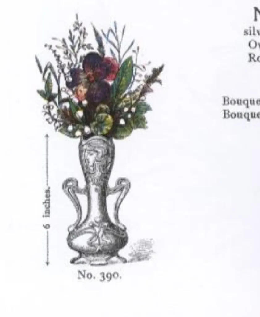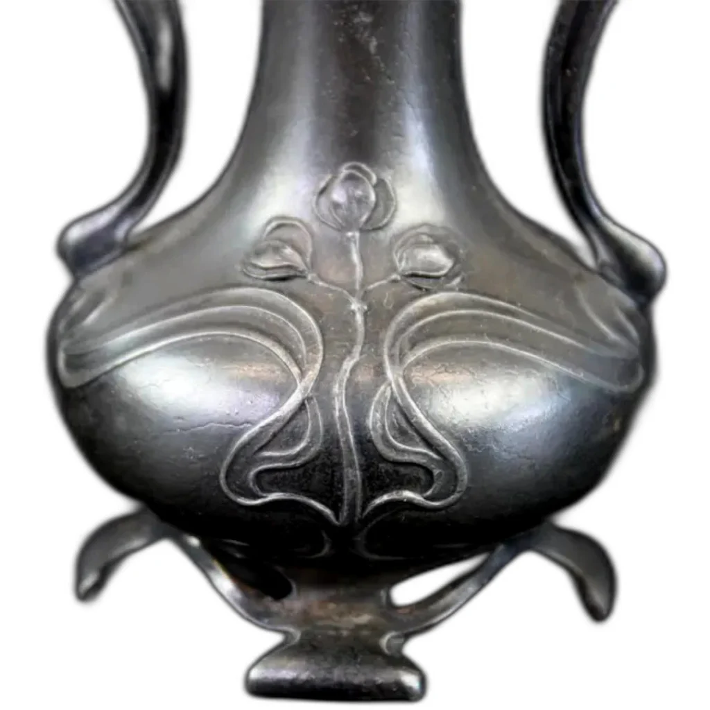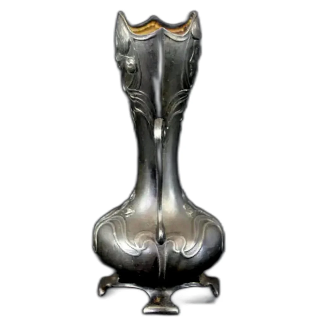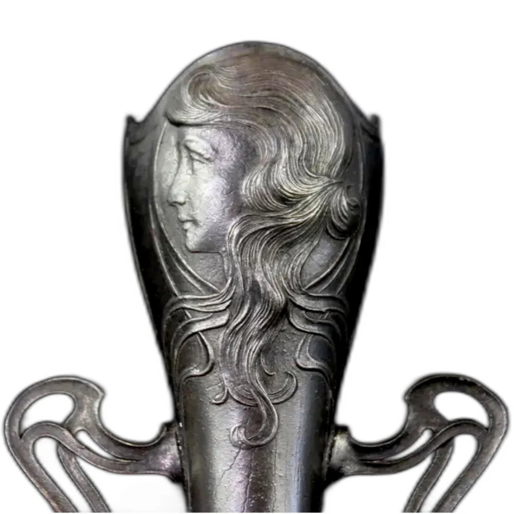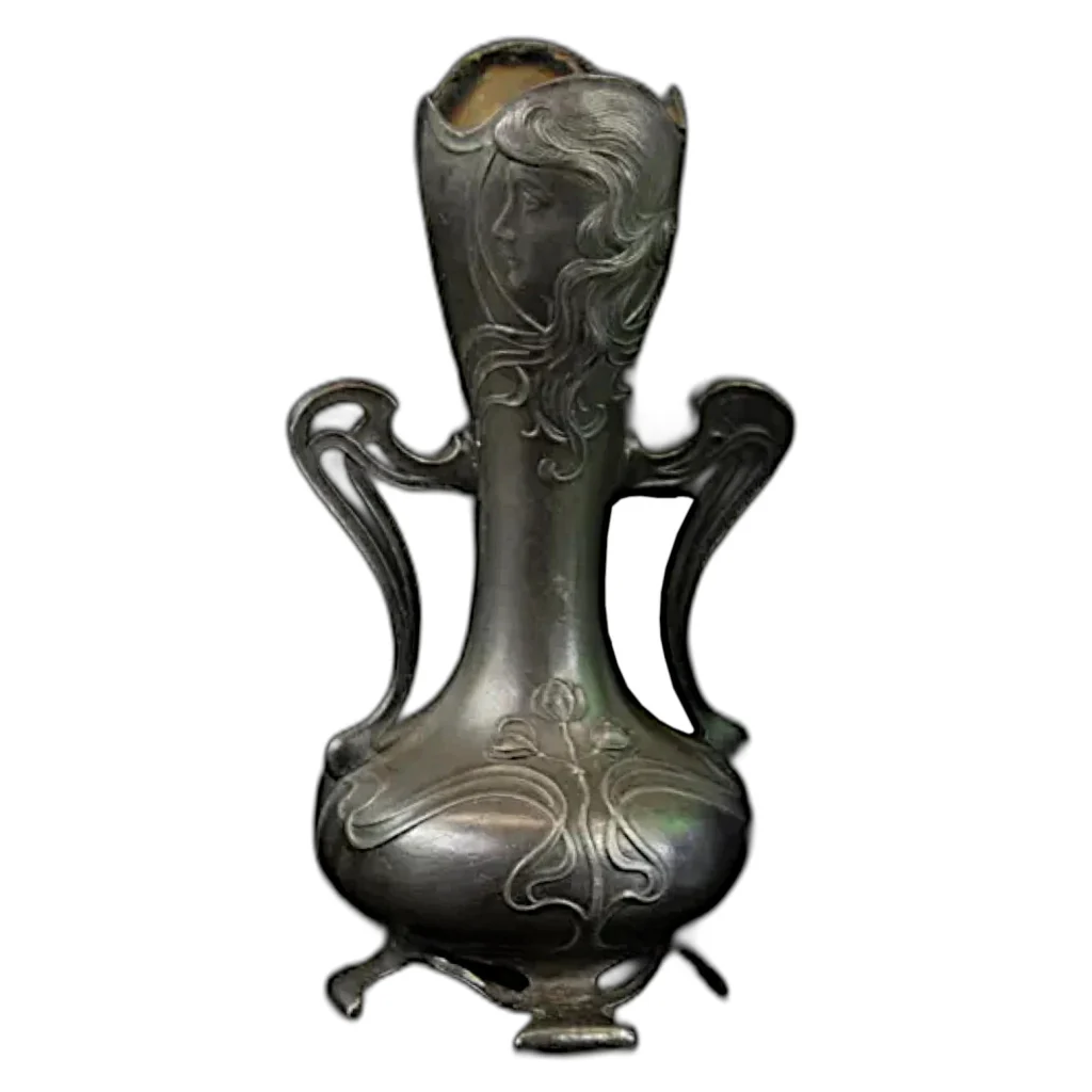 Элегантная миниатюрная вазочка для цветов из сплава Британий с цветочным узором и барельефом женской головки в стиле модерн.