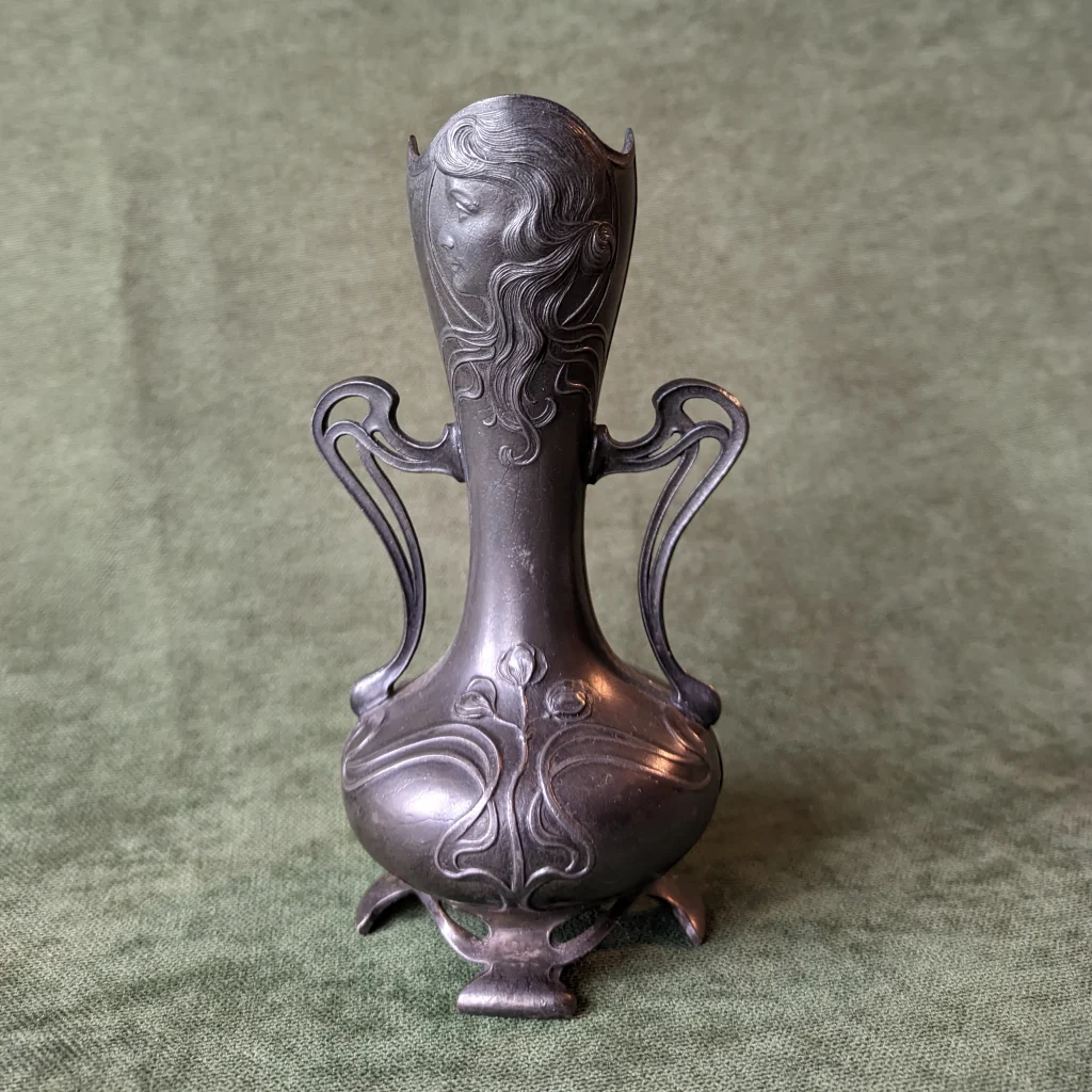 Элегантная миниатюрная вазочка для цветов из сплава Британий с цветочным узором и барельефом женской головки в стиле модерн. Согласитесь, чудо, как хороша.
