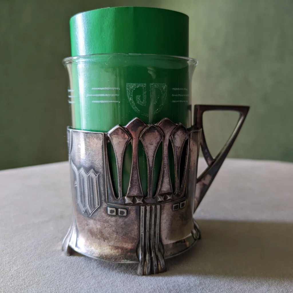 Автор с проблемой был знаком с детства, но лишь частично — доставшийся от отца подстаканник «Тройка» в детском же периоде обеспечивался советскими же стаканами, в 90-ых был украден при выезде из коммунальной квартиры. Пришедшие в жизнь с годами антикварные подстаканники проблему обострили — воровать по согласию вследствие отказа в легальной продаже из спальных вагонов или заводской директорской столовой те самые сткананы с тремя полосками было уже и негде, и бестолку, в антикварные подстаканники не встают. И внутренний диаметр дна не измерить. И вот наконец-то в руки попали с небольшим перерывом два подстаканница с подходящими стаканами, раз и два. Тайна правильных размеров была раскрыта, результат проверен на подстаканниках три. К тому времени в руки попал еще и каталог изделий WMF от 1906г. Стало ясно, что с нашими руками и головой задача решаемая. И она решена — мы делаем стаканы именно для антикварных подстаканников. Более того, с качественно и адекватно выполненным орнаментом. Поскольку болеем мы эпохой Art Nouveau, то первые экземпляры именно для эпохи Модерн.