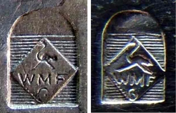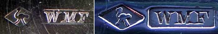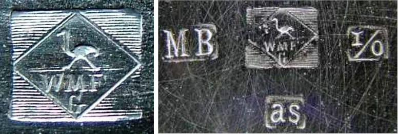 Клеймо для ар-деко WMF, с изображением страуса в гладком ромбе, существует в двух версиях. В первой версии у страуса изображен закругленный хвост, размер ромба около 4,7 мм х 5,6 мм. Во второй версии у страуса хвост обычный, ромб крупнее: 7,3 мм х 9,0 мм. Никаких вторичных маркировок не было отмечено для этого клейма —