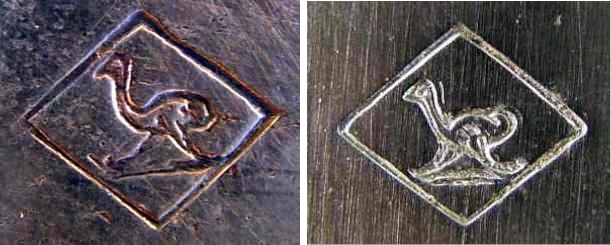 Клеймо такое же, как предыдущее, но фон арки заштрихован частично. Размер арки колеблется между 1,2 мм х 1,8 мм и 2,2 мм х 3,5 мм. Клеймо встречается часто. Существует редкое клеймо, где страус делает больший шаг —