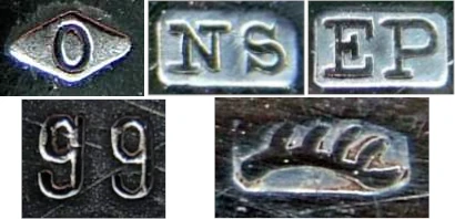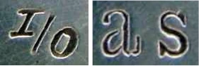 Знак «I/O» означает среднюю толщину серебра, нанесенного на поверхность основного металла, обычно латуни. Знак «as» — искусственное затемнение поверхности серебра почти черного цвета так называемая антикварная серебряная отделка.